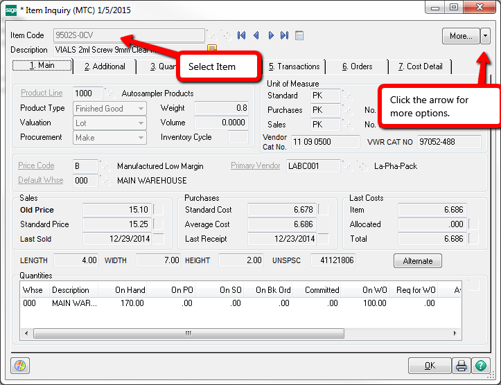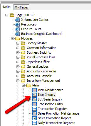 1. Go to SAGE 100; Inventory Management; Item Inquiry
