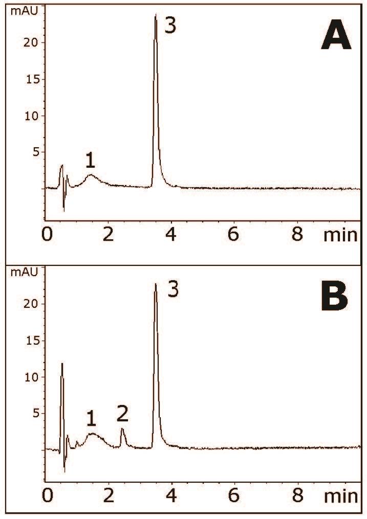 This Method shows the Separation of an ester Prodrug, Mometasone Furoate, from another compound formed during acid hydrolysis. This Peak is quite possibly the active form, Mometasone. The two Chromatograms show the non-degraded extract (Figure A) and an acid hydrolysis extract (Figure B).
