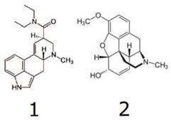 Note: Lysergic Acid Diethylamide (LSD) was synthesized by Swiss chemist Albert Hofmann while researching Ergot Alkaloid Derivatives. It is highly potent and produces significant psychedelic effects when ingested. It is currently a Schedule I drug in the U.S. Codeine is an opiate used for analgesic, antitussive, and other effects. It may be obtained from over-the-counter formulations like Cough Syrup and therefore has potential for abuse.