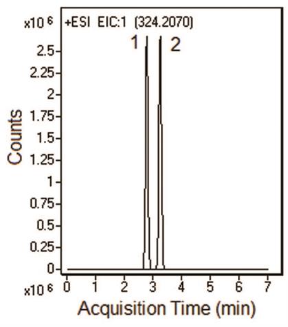 LSD and codeine may be present in Urine samples and methods are needed for their detection in these matrices. The extracted Ion Chromatograms (EICs) for both analytes are shown in the figure and illustrate excellent chromatographic as well as Mass Spectral Separation. The Method in this AppNote produces high Efficiency for both Peaks.