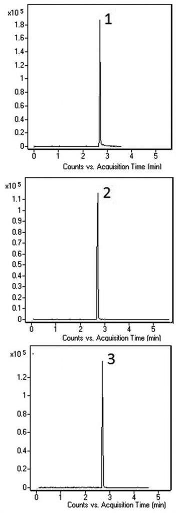 Sample Preparation: Glufosinate (1720.64 ppm), N-Acetylglufosinate (639.2 ppm), and Glufosinate Propanoic Acid (1302.5 ppm) stock solutions were diluted 1:100 with 4:1 DI Water: Methanol