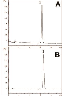 The two chromatograms compare the retention and efficiency of a Cyclobenzaprine peak using two types of Cogent Diamond Hydride columns. Figure A uses a near UHPLC 2.2µm phase while Figure B uses a standard 4µm particle size column. The results show consistent retention between the two phases (about 5% difference) .