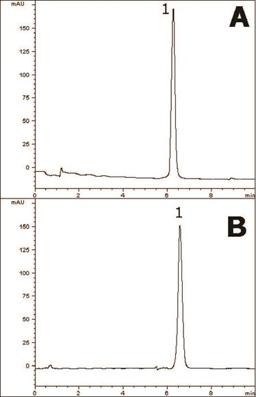 The two chromatograms compare the retention and efficiency of a Cyclobenzaprine peak using two types of Cogent Diamond Hydride columns. Figure A uses a near UHPLC 2.2µm phase while Figure B uses a standard 4µm particle size column. The results show consistent retention between the two phases (about 5% difference).