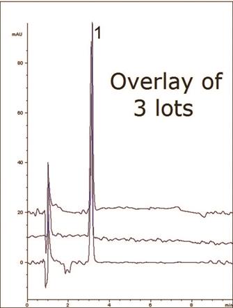 Lot to lot reproducibility of the Cogent Amide Column is highly consistent and reliable. The chromatogram overlay shows results from three different synthesis batches, with a retention time %RSD of 1.2%.