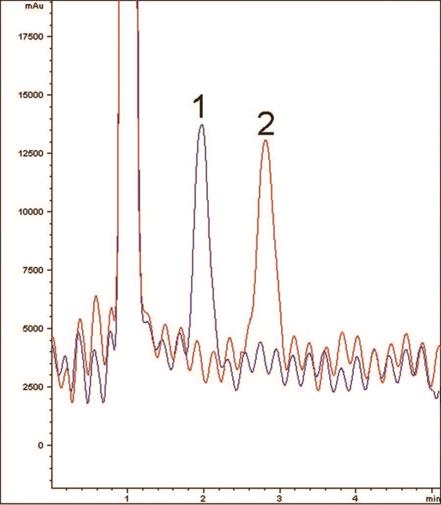 This application demonstrates the ability of the Cogent Amide Column to retain two highly polar test solutes. Sucrose, for example, has a log P of -3.7 and hence would be unlikely to retain in Reversed Phase. Excellent separation is obtained here for these Mono and Disaccharides. The noisy baseline is simply due to the inherent limitations of the Refractive Index Detector, used in this case due to the lack of chromophores in these molecules. The large peak at 1 minute is from the solvent front.