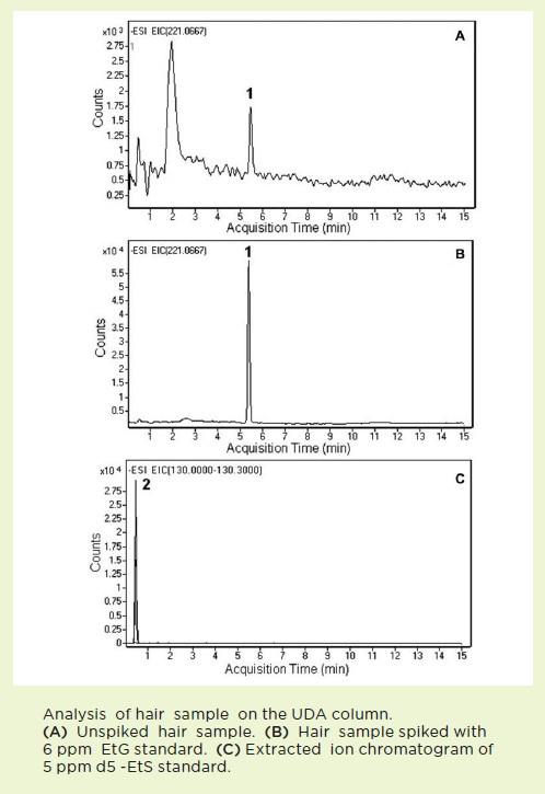 Ethyl Glucuronide and Ethyl Sulfate are compounds that are not well-retained or separated using Reversed Phase Columns due to their hydrophilicity thus requiring high water concentrations in the Mobile Phase.