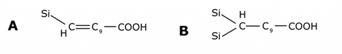 In the second orientation B, another hydrosilation occurs with structure A and a nearby Si-H group, resulting in no more double bonds. This requires that the other Si-H group is close enough to react. This is called a Bidentate attachment.