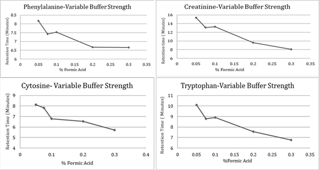 Ionic strength would be expected to have some impact on this processes. Using a lower amount of buffer agents such as formic acid with optimal retention can be a large advantage to using ANP methods. The charts below show examples of 4 compounds and the effect of formic acid in the mobile phase on retention.