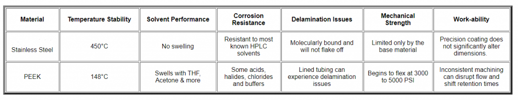 - Work-ability: Machining of PEEK doesn’t produce sufficiently consistent IDs, which disrupts flows and can shift retention times.