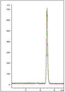 This simple Method shows excellent Peak shape and Reproducibility as shown in the five injection overlay below.