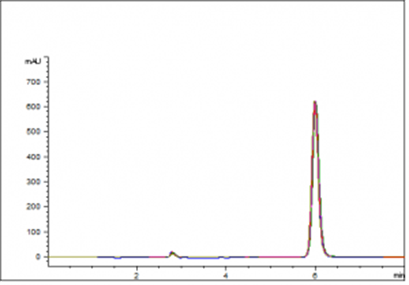 This Similar USP Flumazenil is easily performed, and the 10 injections overlay below demonstrates run to run consistency and great peak symmetry. The peak efficiency is very good and peak tailing guidelines are easily met with RSD values of less than 1.0%.
