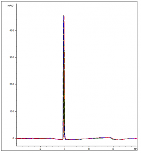 A rapid, sensitive, and Reproducible Method has been developed for Analysis of Indole-3-Butyric Acid. The data below, (overlay of 10 chromatograms ) illustrates how the compound can be adequately Retained and detected using a simple Gradient in Reversed Phase HPLC. The Method demonstrates good Peak Shape and run-to-run Precision with RSD values less than 0.3%.