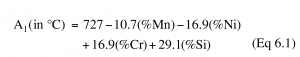 Equation 6.1 shows how the A1 line is lowered by manganese, raised by chromium and nickel, and not affected by molybdenum at its levels in the 4xxx steels. All of these additions reduce the composition of the pearlite point below 0.77%.