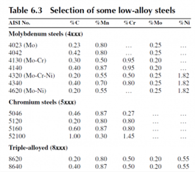 The common alloy steels have one or more of the three elements chromium, molybdenum, or nickel added, and these steels are referred to as the low-alloy AISI steels.