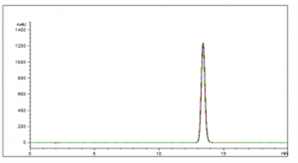This USP Spironolactone is easily performed, and the 10 injections overlay below demonstrates run to run consistency and great peak symmetry. The peak efficiency is very good and peak tailing guidelines are easily met with RSD values of less than 1.0%.