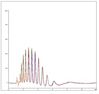The overlay of 5 injections (below) demonstrates reproducibility in separating the polyoxyethylene mixture.