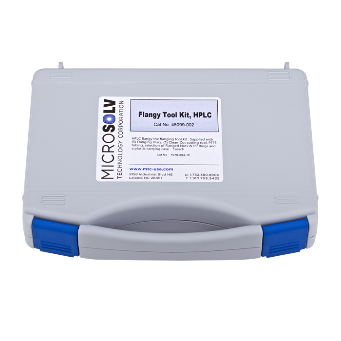 This Kit includes the Flanging Tool, set of 5 flanging drills (pins), a sample of PTFE Tubing that is 1/16" ID x 0.75" OD, six feet long, and the Clean-Cut Tubing Cutting Tool, a selection of Tubing Connectors (nuts) with PP rings and the carrying case.