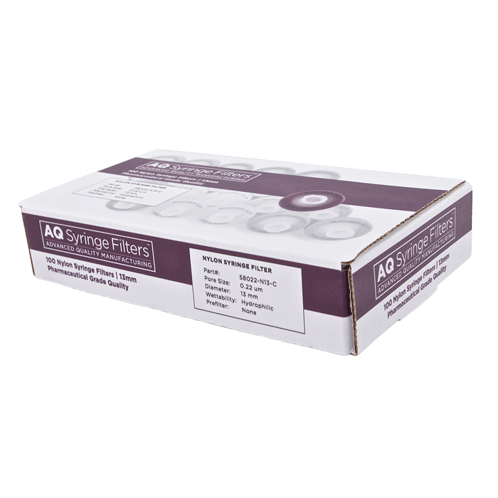 Advanced Quality Nylon-66 Syringe Filters, AQ™ brand, for Pharmaceutical Grade HPLC Dissolution Testing. Manufactured with a unique 0.22µm nylon-66 membrane in a 13mm polypropylene housing, these syringe filters are made for laboratories that require consistent, high performance results with ease of use especially during high volume work. Excellent choice when laboratories cannot afford poor chromatographic results.