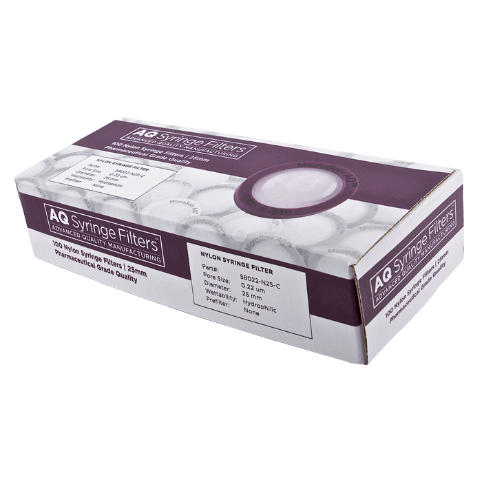 Advanced Quality Nylon-66 Syringe Filters, AQ™ brand, for Pharmaceutical Grade HPLC Dissolution Testing. Manufactured with a unique 0.22µm nylon-66 membrane in a 25mm polypropylene housing, these syringe filters are made for laboratories that require consistent, high performance results with ease of use especially during high volume work. Excellent choice when laboratories cannot afford poor chromatographic results.