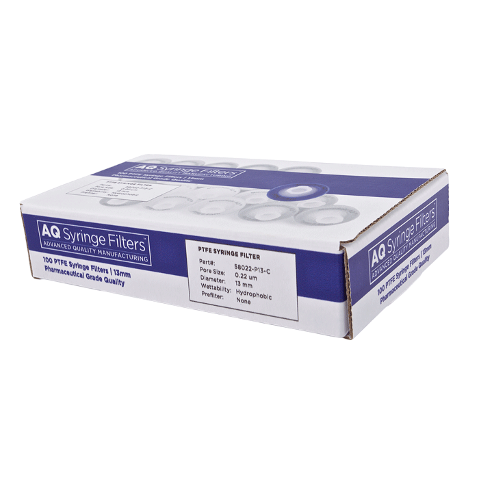 Advanced Quality PTFE Syringe Filters, AQ™ brand, for Pharmaceutical Grade HPLC & Dissolution Testing. Manufactured with a unique 0.22µm PTFE or Polytetrafluoroethylene (purest form of Teflon©) in a 13mm polypropylene housing, these syringe filters are made for laboratories that require consistent, high performance results with ease of use especially during high volume work. Excellent choice when laboratories cannot afford poor chromatographic results.