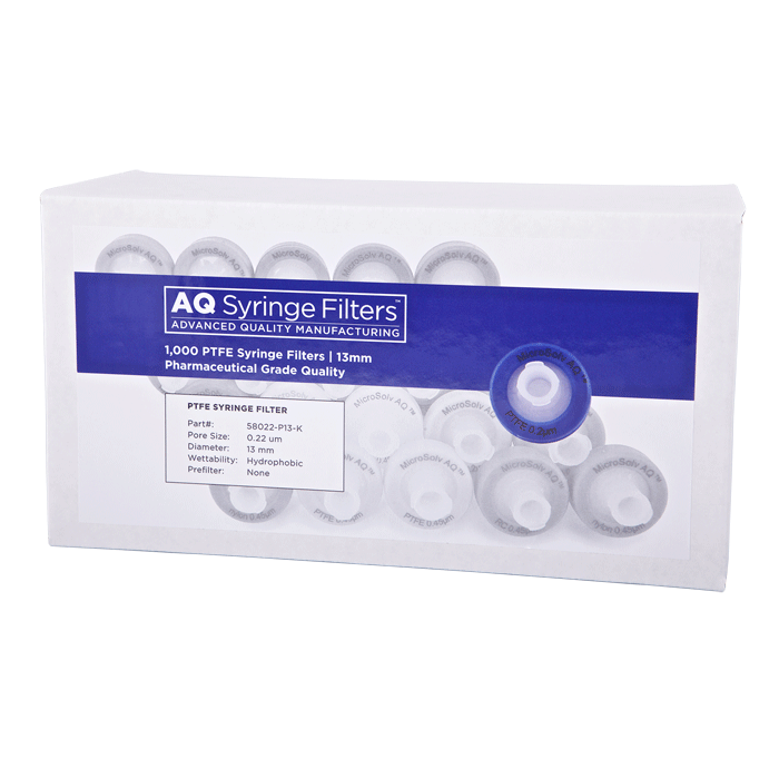 Advanced Quality PTFE Syringe Filters, AQ™ brand, for Pharmaceutical Grade HPLC Dissolution Testing. Manufactured with a unique 0.22µm PTFE or Polytetrafluoroethylene (purest form of Teflon©) in a 13mm polypropylene housing, these syringe filters are made for laboratories that require consistent, high performance results with ease of use especially during high volume work. Excellent choice when laboratories cannot afford poor chromatographic results.