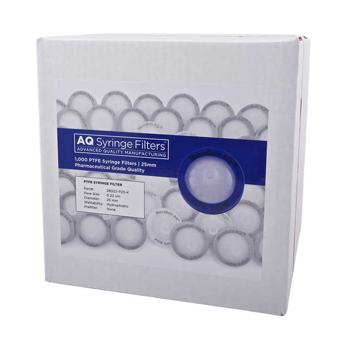 Advanced Quality PTFE Syringe Filters, AQ™ brand, for Pharmaceutical Grade HPLC Dissolution Testing. Manufactured with a unique 0.22µm PTFE or Polytetrafluoroethylene (purest form of Teflon©) in a 25mm polypropylene housing, these syringe filters are made for laboratories that require consistent, high performance results with ease of use especially during high volume work. Excellent choice when laboratories cannot afford poor chromatographic results.