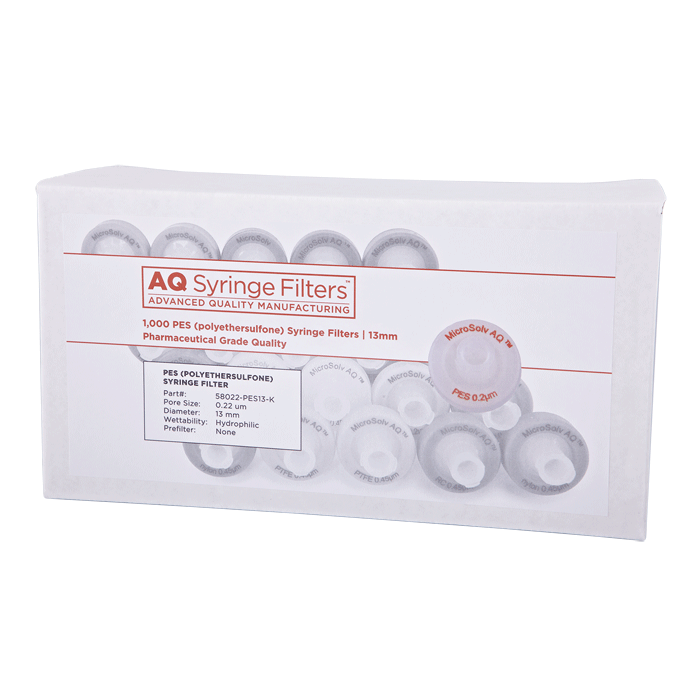 Advanced Quality Polyethersulfone (PES) Syringe Filters, AQ™ brand, for Pharmaceutical Grade HPLC Dissolution Testing. Manufactured with a unique 0.22µm PES membrane in a 13mm polypropylene housing, these syringe filters are made for laboratories that require consistent, high performance results with ease of use especially during high volume work. Excellent choice when laboratories cannot afford poor chromatographic results.