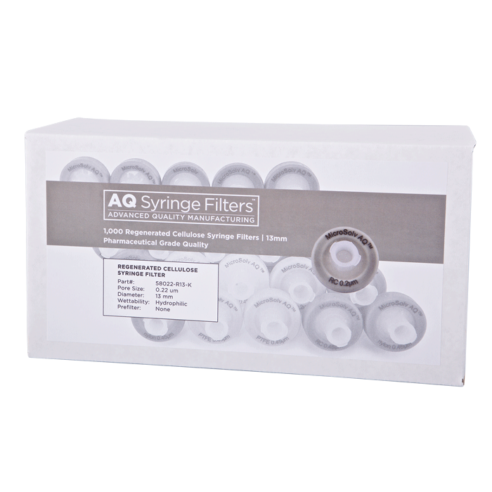 Advanced Quality Regenerated Cellulose Syringe Filters, AQ™ brand, for Pharmaceutical Grade HPLC Dissolution Testing. Manufactured with a unique 0.22µm Regenerated Cellulose Membrane in a 13mm polypropylene housing, these syringe filters are made for laboratories that require consistent, high performance results with ease of use especially during high volume work. Excellent choice when laboratories cannot afford poor chromatographic results.