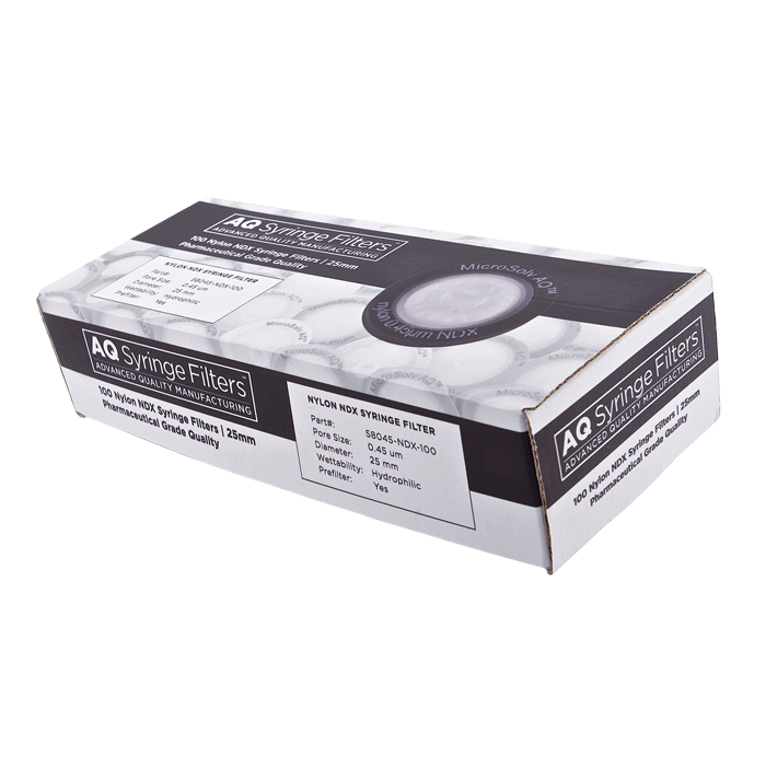 Advanced Quality Nylon-66 Syringe Filters with 3 Binder Free, Borosilicate, Micro-glass-fiber "Pre-Filters", AQ™ brand, for Pharmaceutical Grade HPLC & Dissolution Testing where samples need multiple layers of pre-filters. Manufactured with a unique 0.45µm nylon-66 membrane in a 25mm polypropylene housing, these syringe filters are made for laboratories that require consistent, high performance results with ease of use especially during high volume work. Excellent choice when laboratories cannot afford poor results.