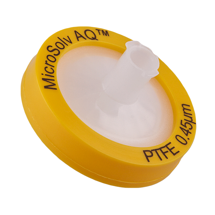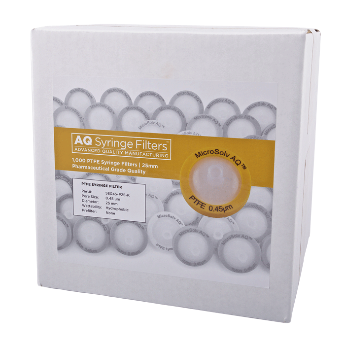 Advanced Quality PTFE Syringe Filters, AQ™ brand, for Pharmaceutical Grade HPLC & Dissolution Testing. Manufactured with a unique 0.45µm PTFE or Polytetrafluoroethylene (purest form of Teflon©) in a 25mm polypropylene housing, these syringe filters are made for laboratories that require consistent, high performance results with ease of use especially during high volume work. Excellent choice when laboratories cannot afford poor chromatographic results.