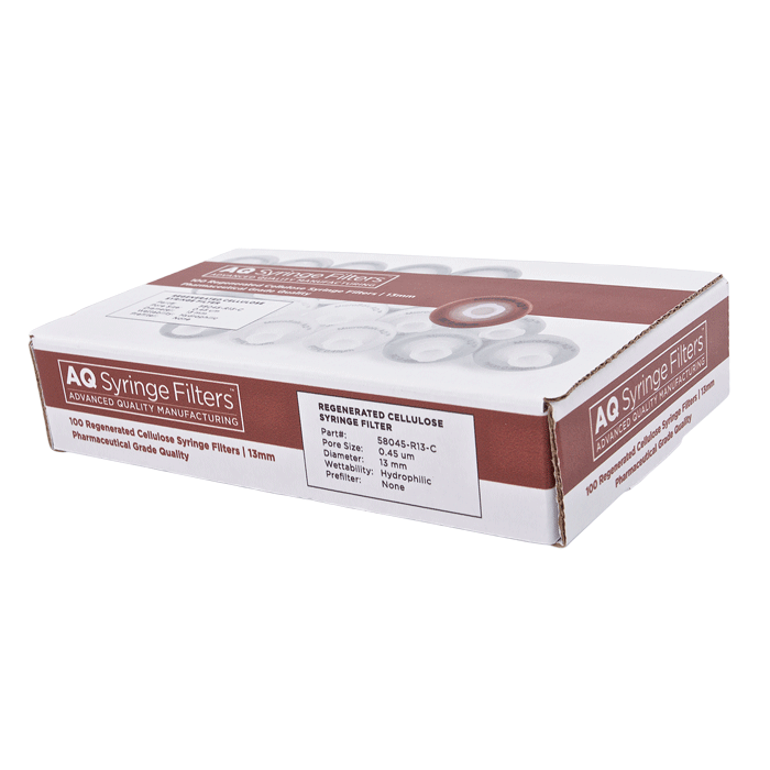 Advanced Quality Regenerated Cellulose Syringe Filters, AQ™ brand, for Pharmaceutical Grade HPLC & Dissolution Testing. Manufactured with a unique 0.45µm Regenerated Cellulose Membrane in a 13mm polypropylene housing, these syringe filters are made for laboratories that require consistent, high performance results with ease of use especially during high volume work. Excellent choice when laboratories cannot afford poor chromatographic results.
