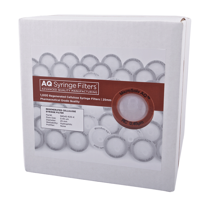 Advanced Quality Regenerated Cellulose Syringe Filters, AQ™ brand, for Pharmaceutical Grade HPLC & Dissolution Testing. Manufactured with a unique 0.45µm Regenerated Cellulose Membrane in a 25mm polypropylene housing. These syringe filters are made for laboratories that require consistent, high performance results with ease of use especially during high volume work. Excellent choice when laboratories cannot afford poor chromatographic results.