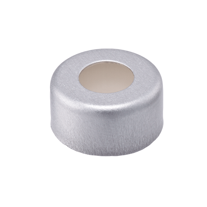 Caps, Crimp Top, Silicone Rubber / PTFE, ultra-pure Septa, fitted in aluminum, Silver Caps. For use with 11mm Crimp or Snap Top, 12x32mm autosampler vials. AQR Brand. 100/PK.