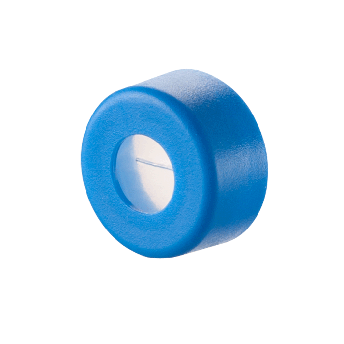 Caps, Snap Top, with Silicone Rubber / PTFE, ultra-pure, Pre-Slit Septa, fitted in smooth, polyethylene, Light Blue Caps. For use with 11mm, 12x32mm, Snap Top autosampler vials. AQR Brand. 100/PK.