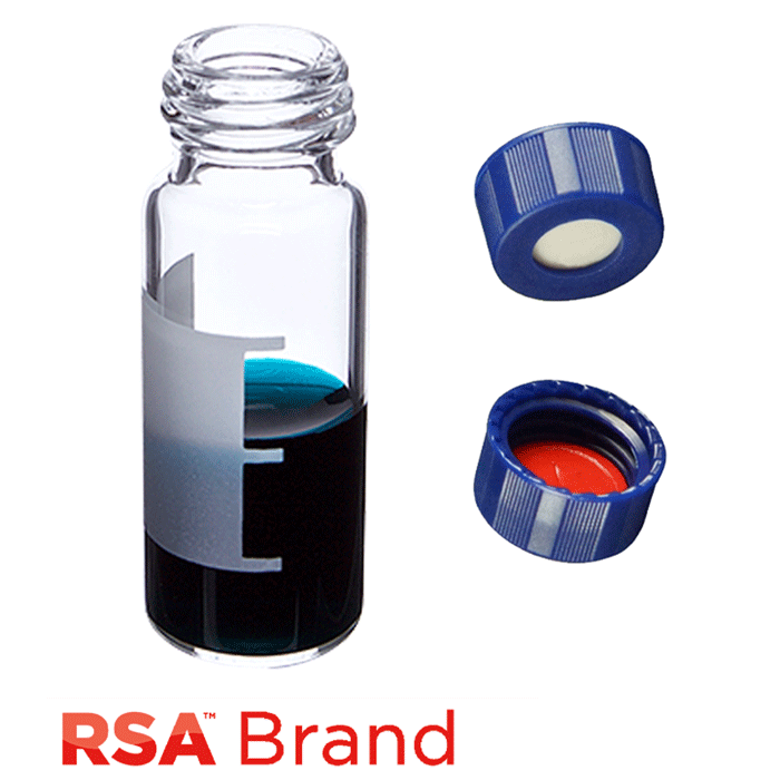Vial & Cap Kit Includes 100 EA 2ml, Screw Top, Clear RSA™ Autosampler Vials with Write-On Patch and fill lines and 100 EA matching Screw Caps with White Silicone Rubber / Red PTFE Pre-Slit Soft-Guard Septa, bonded in the Blue Caps. Vials and Caps are Pre-assembled. RSA Brand Easy Purchase Pack. 1 PK.