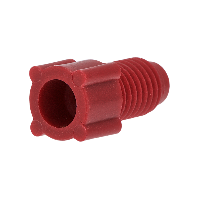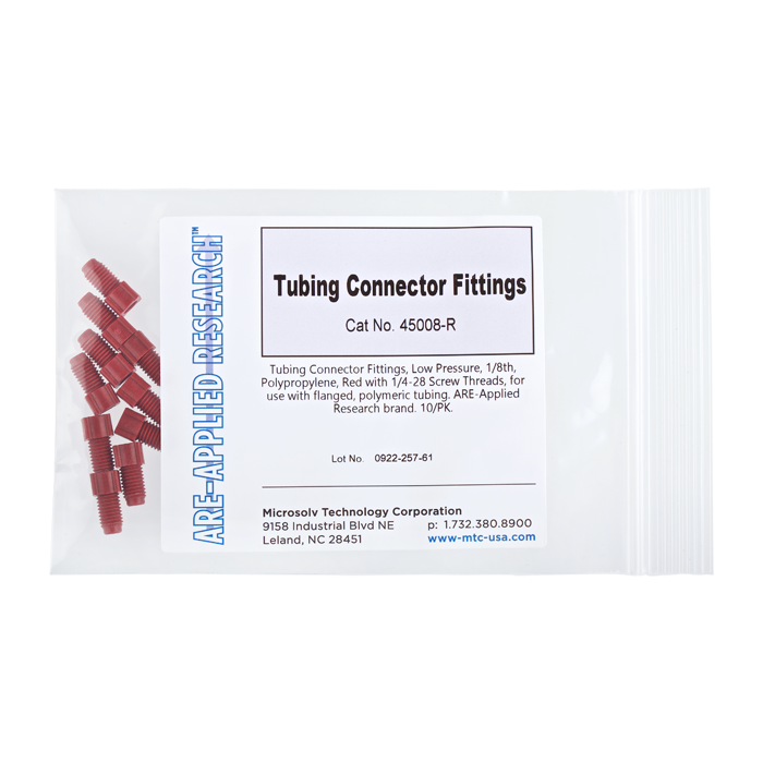 Tubing Connector Nuts, low pressure, 1/8 inch, Polypropylene, Red with 1/4-28 screw threads, for use with flanged, polymeric tubing. ARE-Applied Research brand. 10/PK.