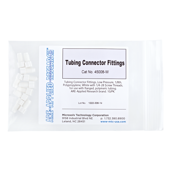 Tubing Connector Nuts, low pressure, 1/8 inch, Polypropylene, White with 1/4-28 screw threads, for use with flanged, polymeric tubing. ARE-Applied Research brand. 10/PK.