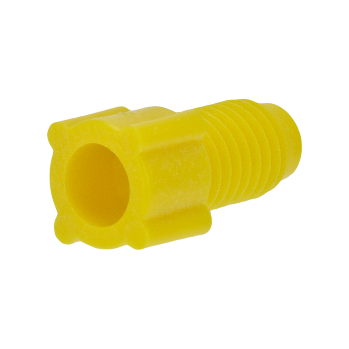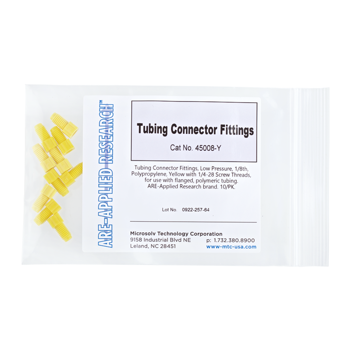 Tubing Connector Nuts, low pressure, 1/8 inch, Polypropylene, Yellow with 1/4-28 screw threads, for use with flanged, polymeric tubing. ARE-Applied Research brand. 10/PK.