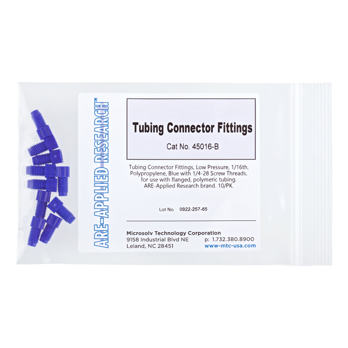 Tubing Connector Nuts, low pressure, 1/16 inch, Polypropylene, Blue with 1/4-28 screw threads, for use with flanged, polymeric tubing. ARE-Applied Research brand. 10/PK.