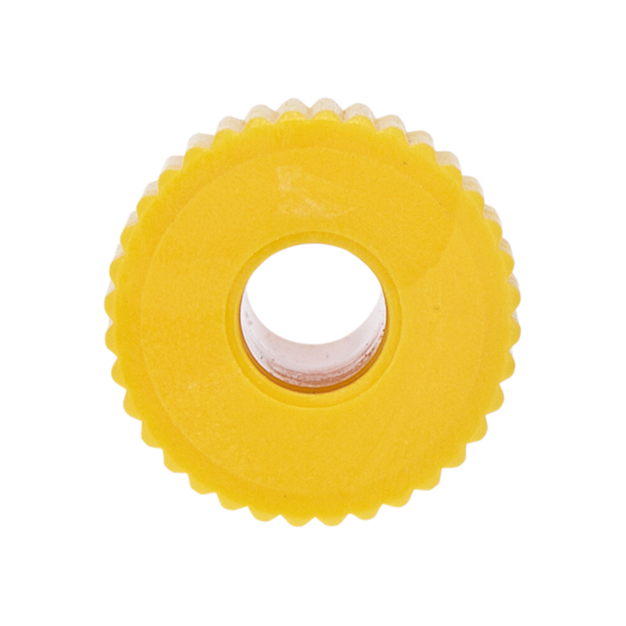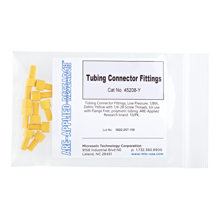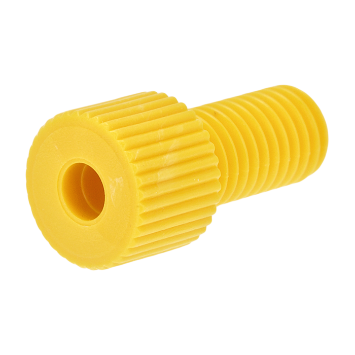Tubing Connector Nuts, low pressure, 1/8 inch, Delrin, Yellow with 1/4-28 screw threads, for use with flange free, polymeric tubing. ARE-Applied Research brand. 10/PK.