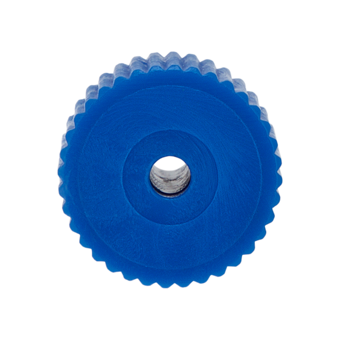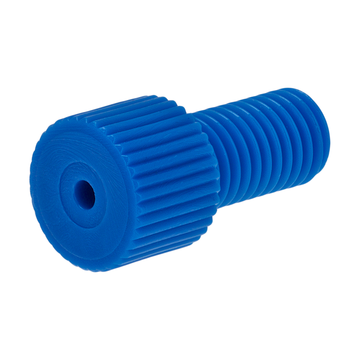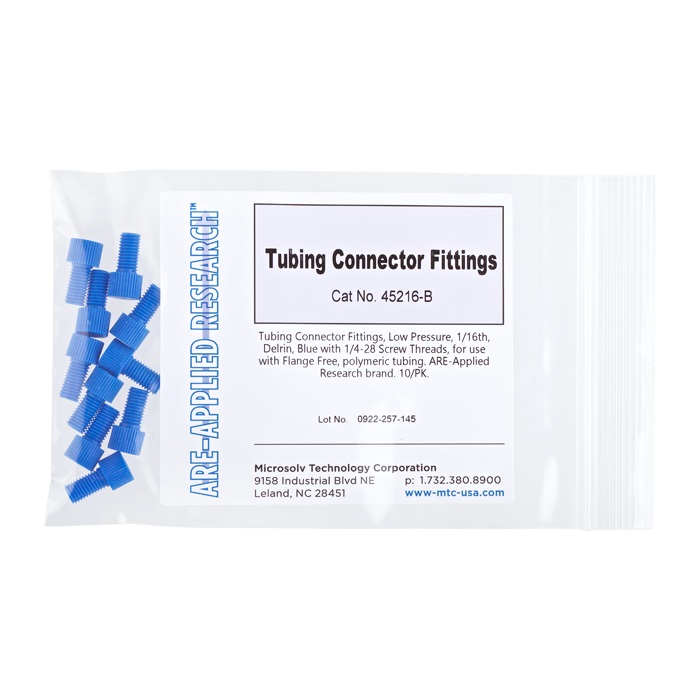 Tubing Connector Nuts, low pressure, 1/16 inch, Delrin, Blue with 1/4-28 screw threads, for use with flange free, polymeric tubing. ARE-Applied Research brand. 10/PK.