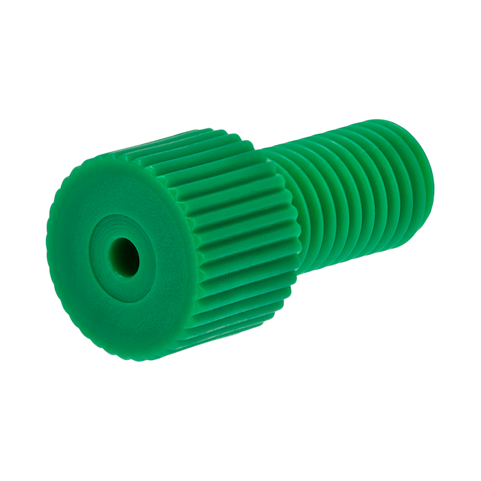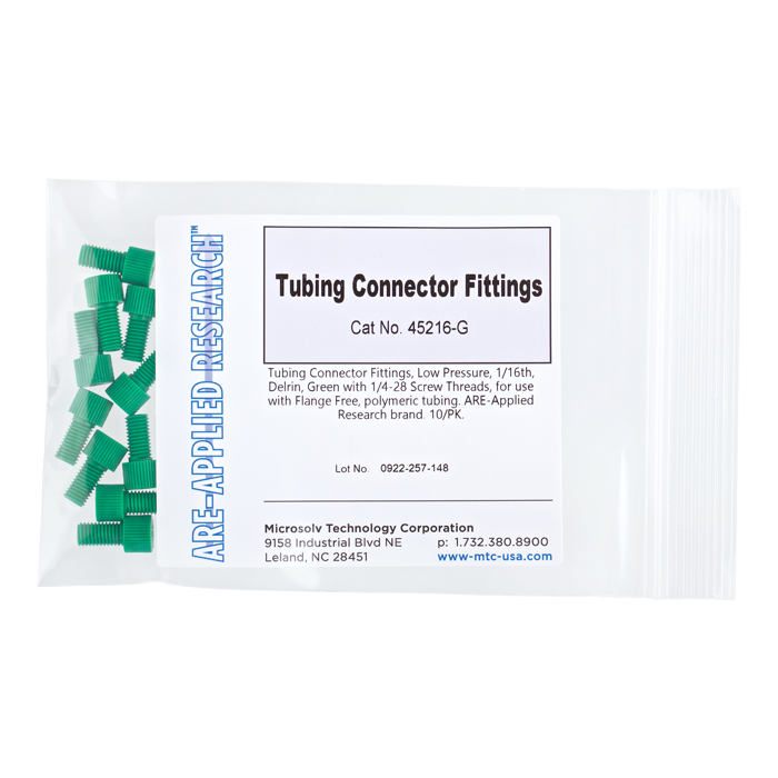 These tubing connector nuts are used to connect 1/16th inch (1.6 mm) OD polymeric tubing in the low pressures zones of HPLC systems and other low pressure, fluidic uses.