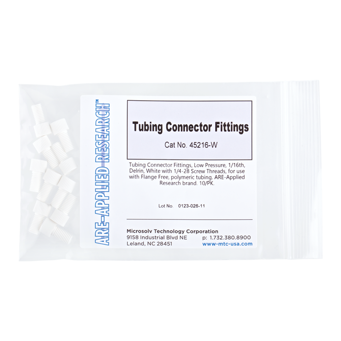 Tubing Connector Nuts, low pressure, 1/16 inch, Delrin, White with 1/4-28 screw threads, for use with flange free, polymeric tubing. ARE-Applied Research brand. 10/PK.