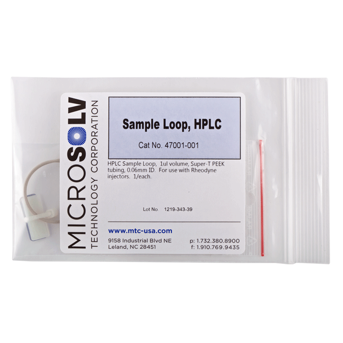 A label with the sample loop volume is attached. Use these loops with Rheodyne® or Cheminert® brands of injector valves.