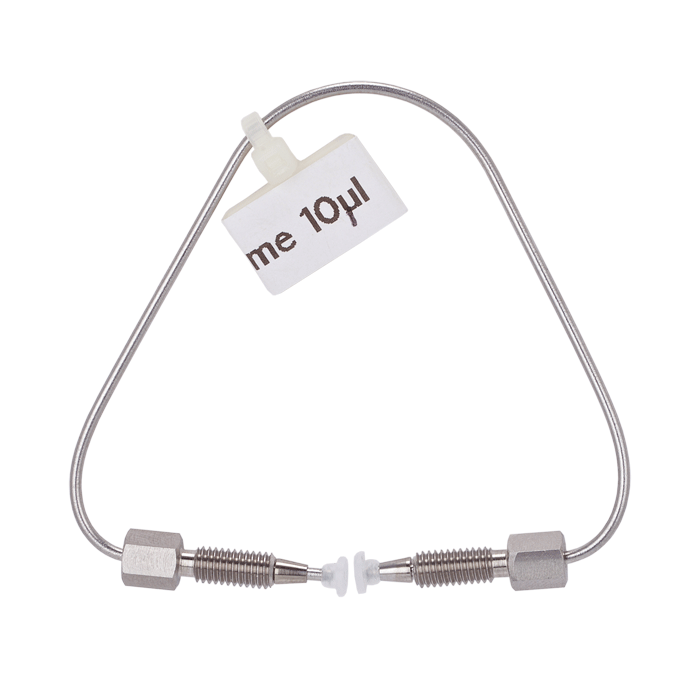Tubing is 0.25mm ID (+/- 0.025mm) and is supplied with 2 two-piece, small hex head, SS, high pressure tubing connectors with ferrules for fitting on the injectors. Tubing end cuts are made using EDC (electronic discharge) techniques to achieve square and burr free ends for zero-dead volume connections. A label with the loop volume is attached.