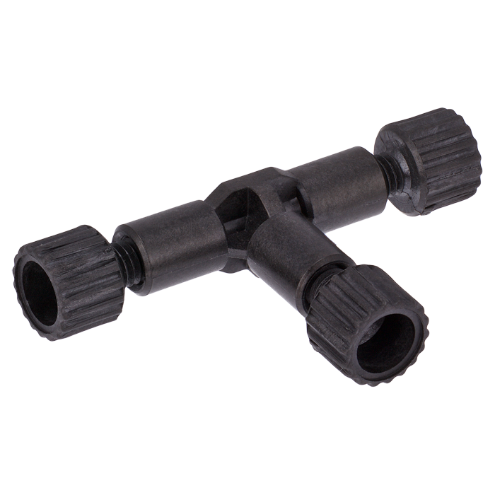 Union, Connector Kits, Tee, high pressure, 0.50 mm / 0.020 through hole with 10-32 screw threads. Carbon PEEK Endure, with connector nuts. Use with 1/16 tubing. ARE-Applied Research brand. Bulk Price.