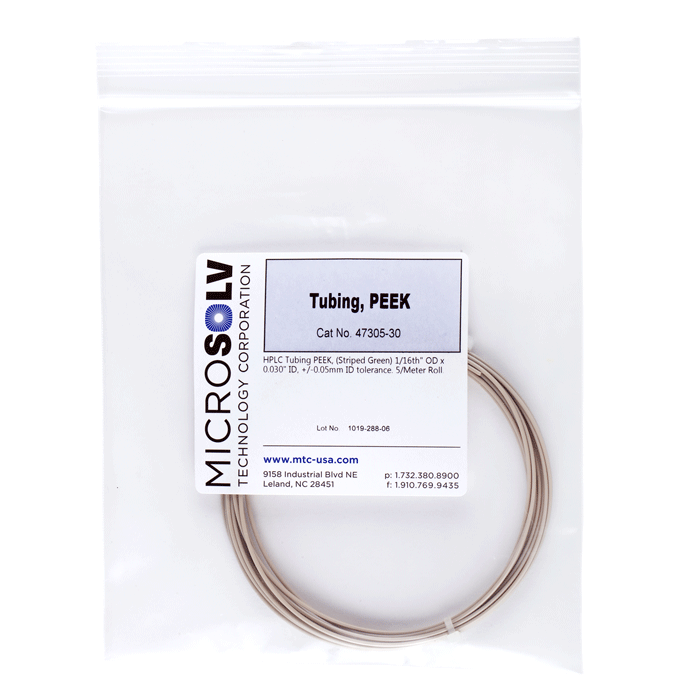 This HPLC grade tubing is extruded from virgin PEEK material without any manufacturing additives. The green stripe is added only to the outside of the tubing, leaving the interior all natural PEEK which eliminates leachables due to color.