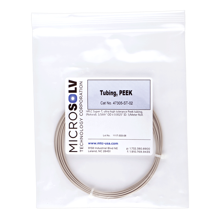 Tubing, PEEK, 0.0025 inch (0.064 mm) ID, 1/16th inch (1.6 mm) OD, Ultra-T grade, natural color, 5 meter roll, ARE-Applied Research brand. 1 EA.