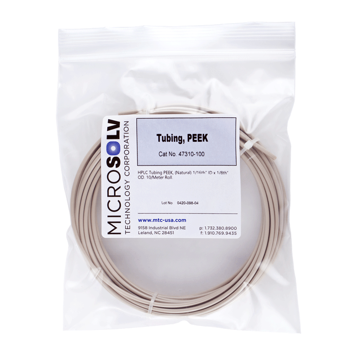 Tubing, PEEK, 1/16th inch (1.6 mm) ID, 1/8th inch (3.2 mm) OD, HPLC grade, natural color, 10 meter roll, ARE-Applied Research brand. 1 EA.