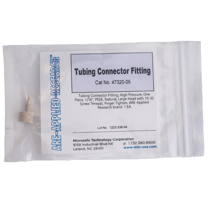 Tubing Connector Fittings, high pressure, one piece, 1/16 inch, PEEK, Natural, large head with 10-32 screw threads. Finger tighten, ARE-Applied Research brand. 1 EA.